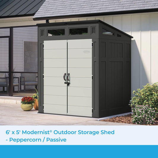 Suncast 6' x 5' Modernist Storage Shed for Yard Storage, All-Weather Outdoor Storage Shed with 2 Lockable Doors and Windows, Peppercorn