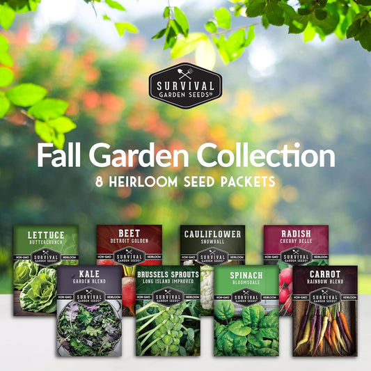 Fall Vegetable Seed Collection - 8 Packs of Non-GMO Heirloom Open-Pollinated Vegetables - Plant in Late Summer for Autumn Harvest - Seed Saver Instructions on Packets - Survival Garden Seeds